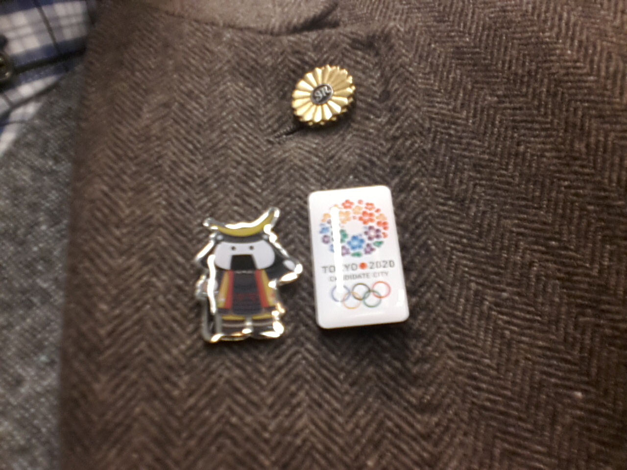 オリンピック招致のバッヂの隣は、宮城県のゆるキャラのむすび丸