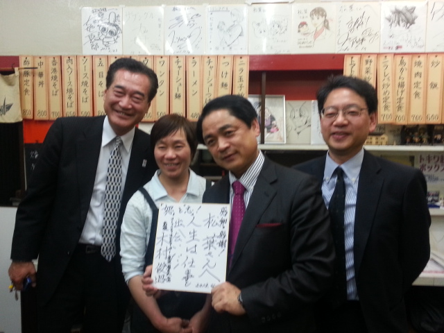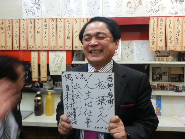 本日の基調講師 木村俊昭先生が、漫画家のサインが並ぶ松葉の店内にサインを掲げることに!