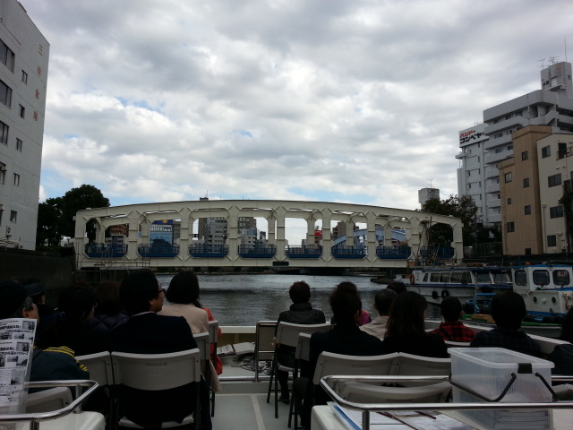 歴史ガイドを聞きながら、日本橋→江戸橋→鎧橋→茅場橋→湊橋→豊海橋を通過し隅田川へ。