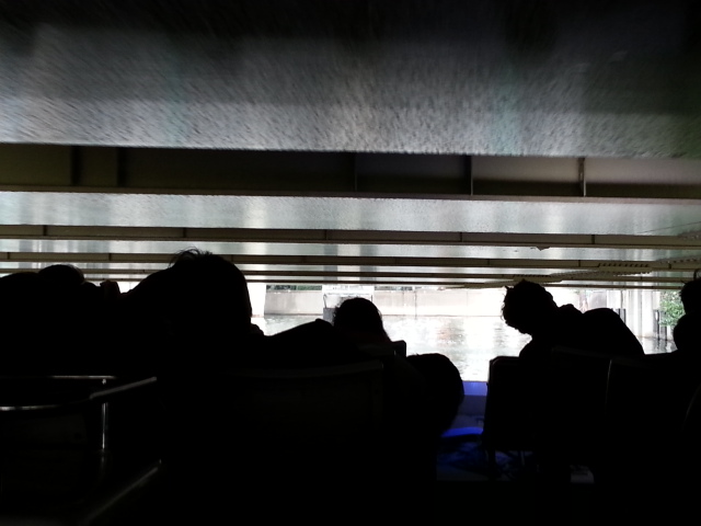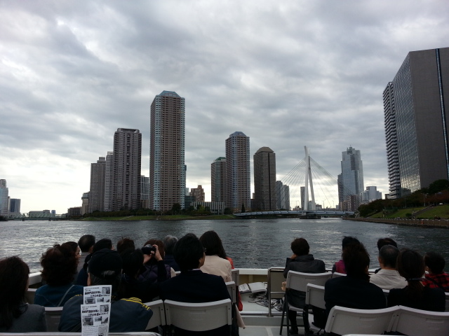隅田川大橋(箱崎ジャンクションと水天宮前周辺)→中央大橋と大川端リバーシティ21→月島を眺めながら勝鬨橋の手前でUターン。亀島川水門→八丁堀を眺めながら霊岸橋を経て日本橋水門で日本橋川に戻り、滝の広場のある船着場へ帰還するコースでした。
