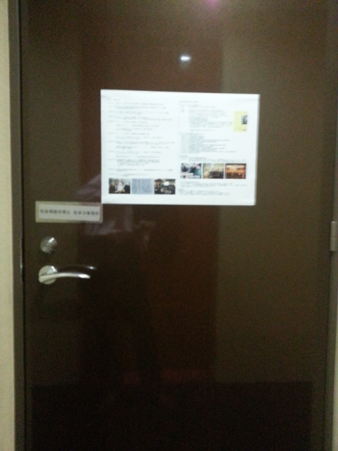 「もったいない」という言葉は、クールビズ同様に小池さんのキャッチコピーですが、予てより気になっていたのは、事務所名プレートの不透明性と扉の有効利用について。事務所名プレートは家主指定ですが、スチールプレート(シルバー)に黒文字を印字しているので、何と書いているか、見ようと思ってわざわざ目を近づけないと、誰もわからないという代物。かつ扉のデッドスペースをうまく広報に利用したいと考えていたことから、本日、決行することにした。