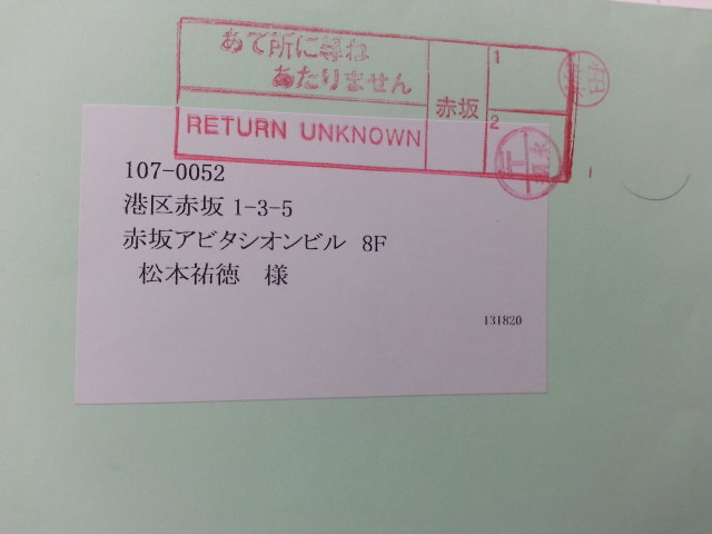 以前、うちの事務所への郵送物が返却されたようだ。