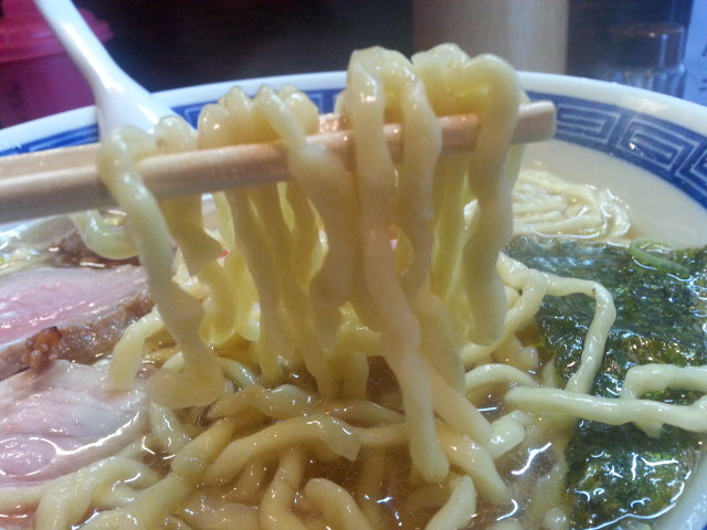 スープ一口目。煮干しの味はさほどきつくないし、スープも店頭写真と相違し、グリーン系とは程遠い。