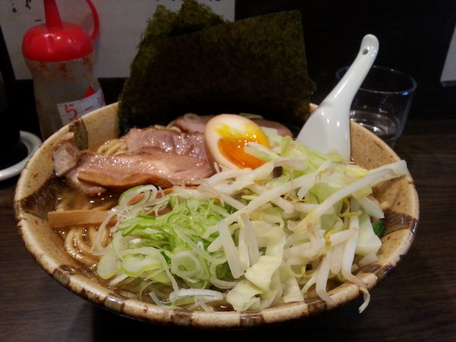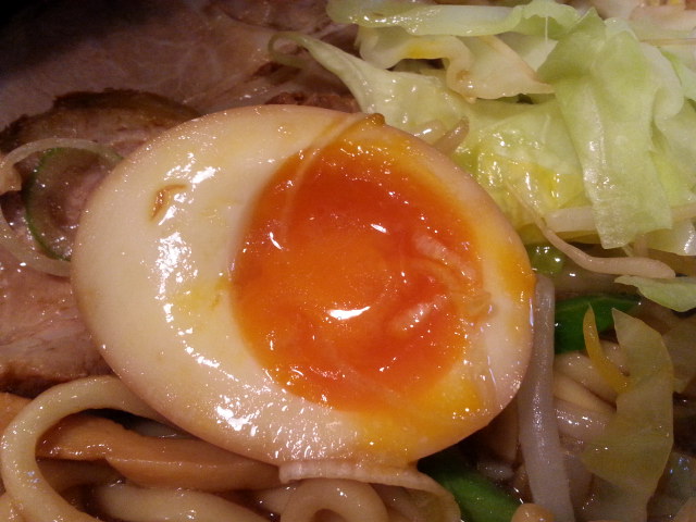 通常のらーめんに、トッピング450円肉4枚のハーフ(2枚)・トッピング100円野菜の1/2・味玉ハーフ、海苔1枚がプラスされるのです。