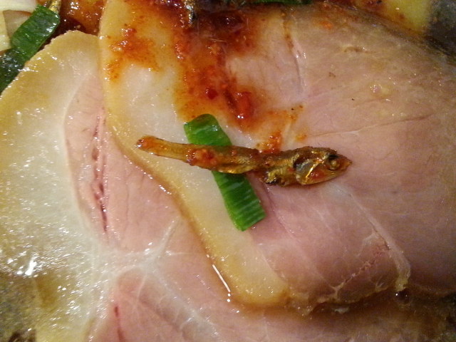 具材は、煮干くんが唐辛子カラーのタレに絡まっている。