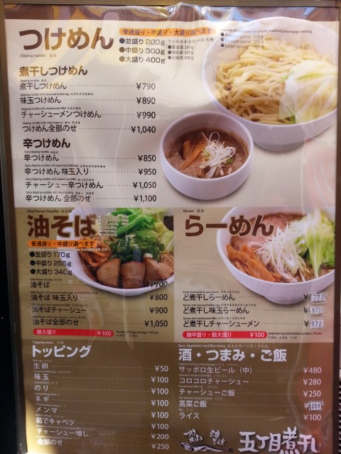 | ⑤トッピング | 生卵 50円 味玉・海苔・長ネギ・メンマ・辛味噌・茹でキャベツ 100円 チャーシュー増し 200円 全部のせ 250円 |