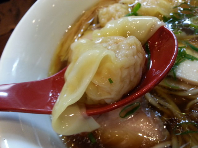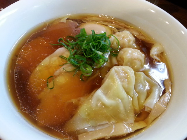 味玉1個、チャーシュー1枚、鶏チャーシュー2枚、ワンタン3枚。