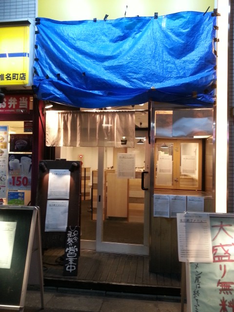 でもさ、暖簾はのっぺらぼうだし、店看板はブルーシートで隠されている。