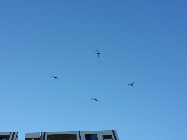 ヘリが5機、群れをなして飛んでいた(画像で写せたのは編制を組んでいた4機)
