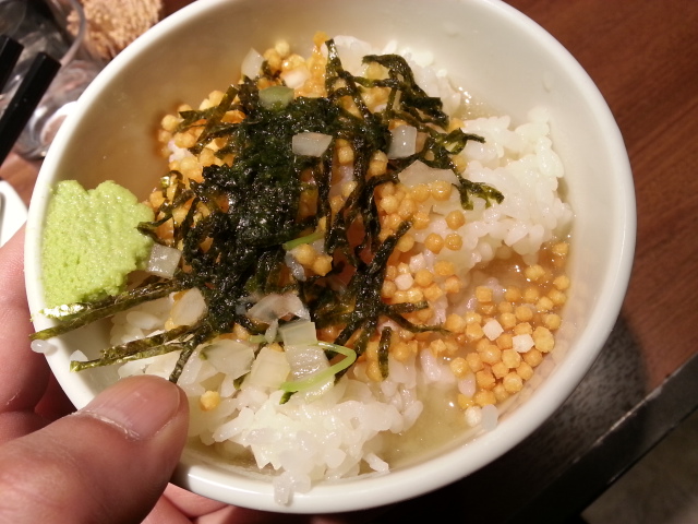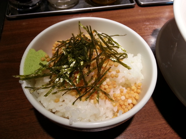 麺を食べ終えて、あられご飯にスープを入れてお茶漬けにしました。