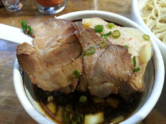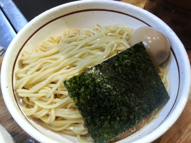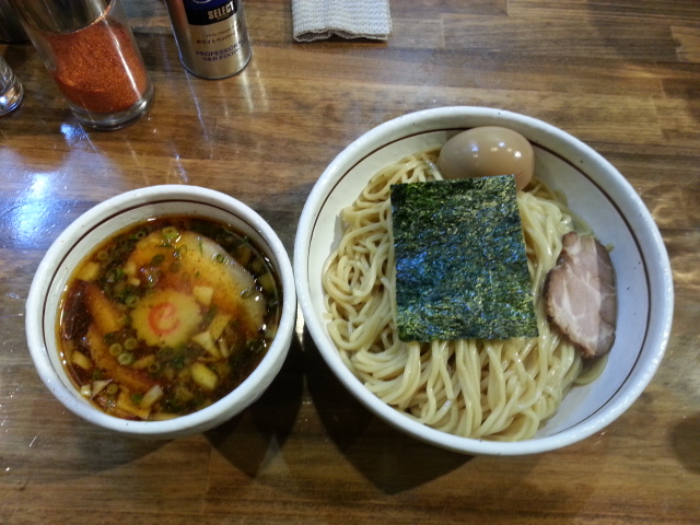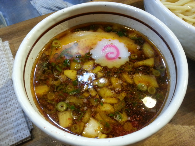 つけ汁はしな中の煮干しつけそばと相違し、赤みを帯びている。