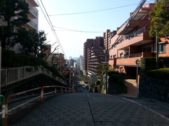 目白通り(めじろ台・関口方面へ続く高台の道路)と神田川(川は低地を流れる)を結ぶ勾配は最大13度(23パーセント)の坂。