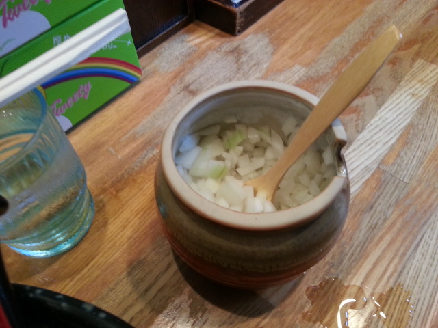 店内に入ったときにひとつ開けて座るお客さんがタマネギの入った壺を渡してくれていた。