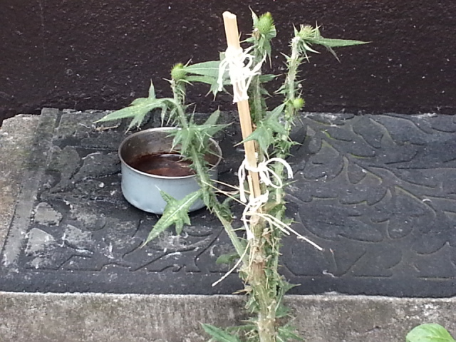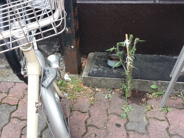 すると、「はーい!おばさん」はポットに入れた水を、フレームロック路面の隙間から生えた雑草(?)に撒き始めた。。。