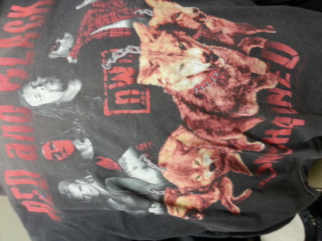 こんな感じだよ。米国で買った赤nWoのTシャツ。