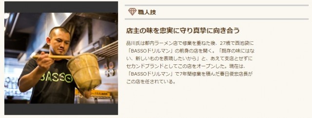 品川氏は都内ラーメン店で修業を重ねた後、27歳で西池袋に「BASSOドリルマン」の前身の店を開く。「既存の味にはない、新しいものを表現したいから」と、あえて支店とせずにセカンドブランドとしてこの店をオープンした。現在は、「BASSOドリルマン」で7年間修業を積んだ春日俊宏店長がこの店を任されている。