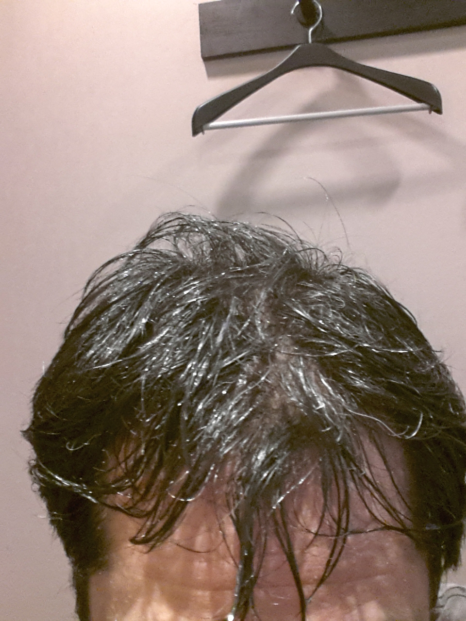 寝ぐせが雨水で濡れた頭髪。