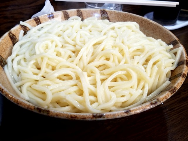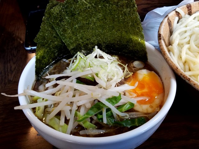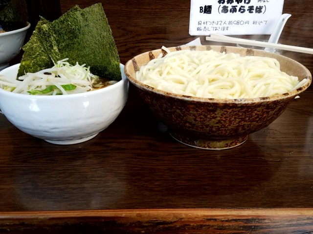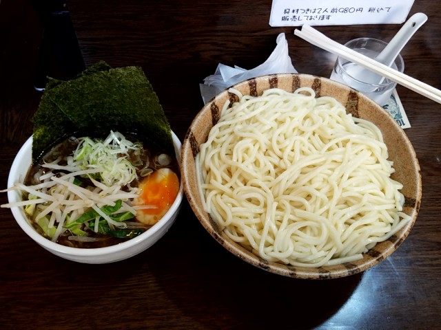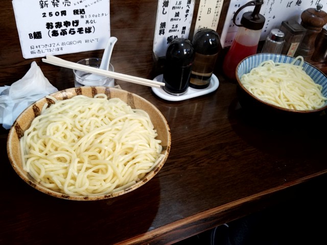 土曜の麺舗十六。 朝10:30オープンでも列び客が出る。 本日は開店15分前に到着→9席の7番目。 オーダーは あつもり十八番トッピング1000円 サービスオプション=ネギ増、麺多め700g ちょうどお隣のお客さんが並を注文。 比較してみました。 そうそう、並とはいえ、麺舗十六の並は、他店の並盛の倍あります。 要するに大盛です。 それでも「多め」とはこれだけの差が出ます!