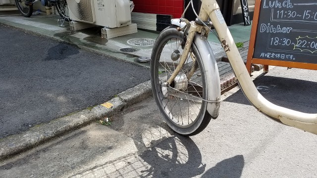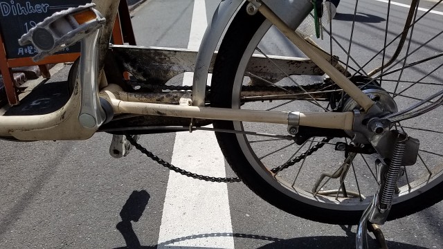 店を出て自転車をバックに引いて道路に出すとき「ひょっとして段差がチェーン外れの原因では?」と思った瞬間、縁石の段差の振動で見事、チェーンが外れた!