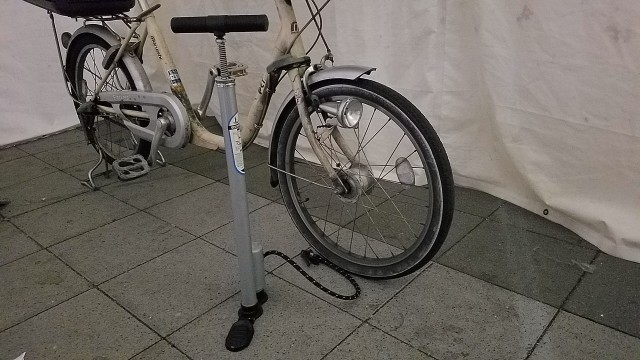明日の朝、帰宅時に、タイヤから空気が抜けていたら困るので、やむを得ず、自転車カゴに空気入れを携帯して外出した。