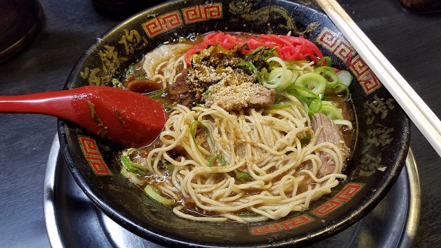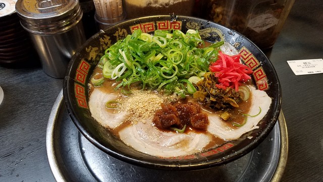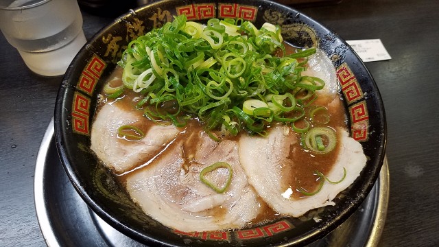 ※赤とんこつの場合は、ねぎの代わりにトマトとくずチャーシュー+標準と細麺がチョイス可能