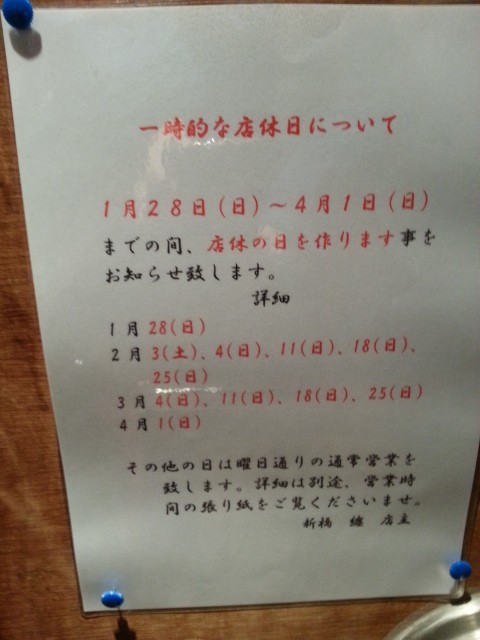 1/28~4/1までの期間、一時的にお店の休日が告知されていました。