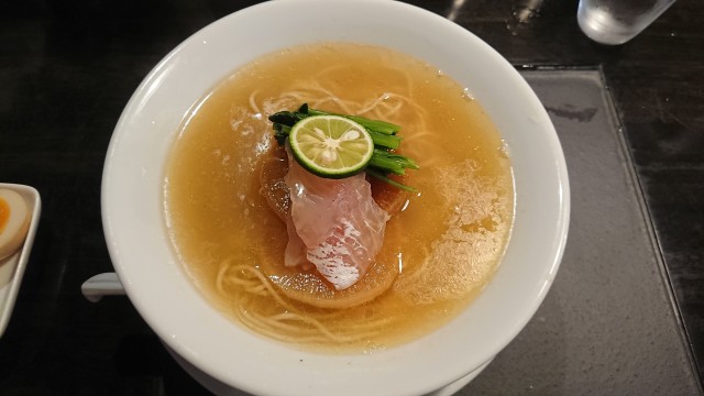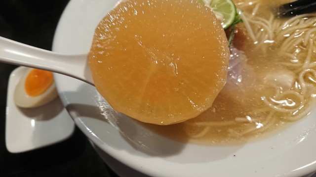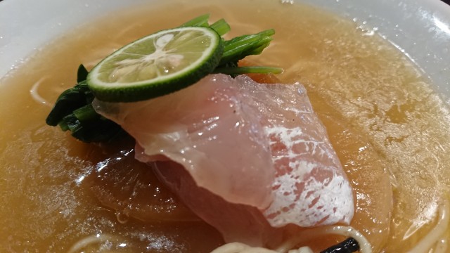 具材は、真鯛、大根、ほうれん草、メンマ、鶏チャーシュー、酢橘。