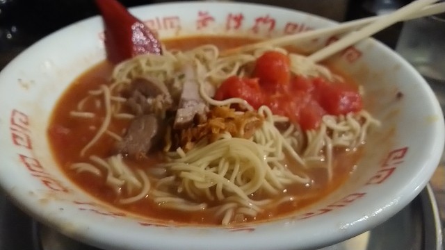 赤とんこつらーめん 850円・・・トマト(標準・ただし替玉のみ標準と細麺から選択)