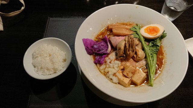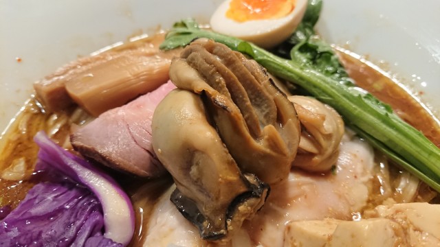 広島県産牡蠣3粒、春菊、焼豆腐、紫(赤)キャベツ、低温豚チャーシュー、鶏チャーシュー、タマネギ、メンマ、味玉ハーフ。
