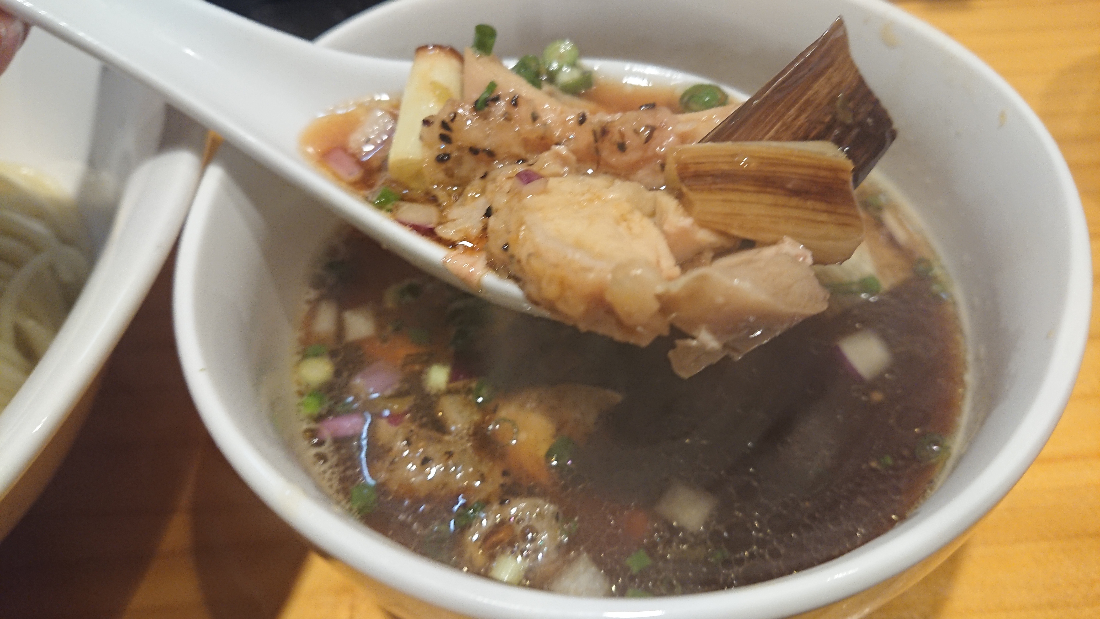 今月の限定は「鶏肉と焼きネギのつけそば」