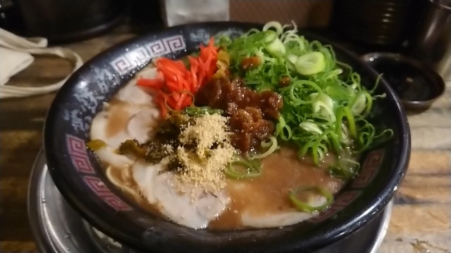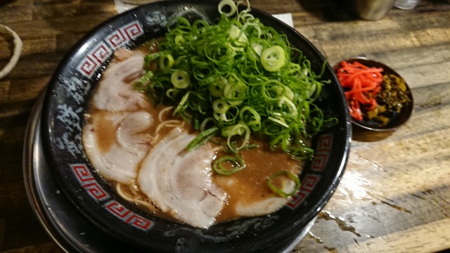 ※赤とんこつの場合は、ねぎの代わりにトマトとくずチャーシュー+標準と細麺がチョイス可能