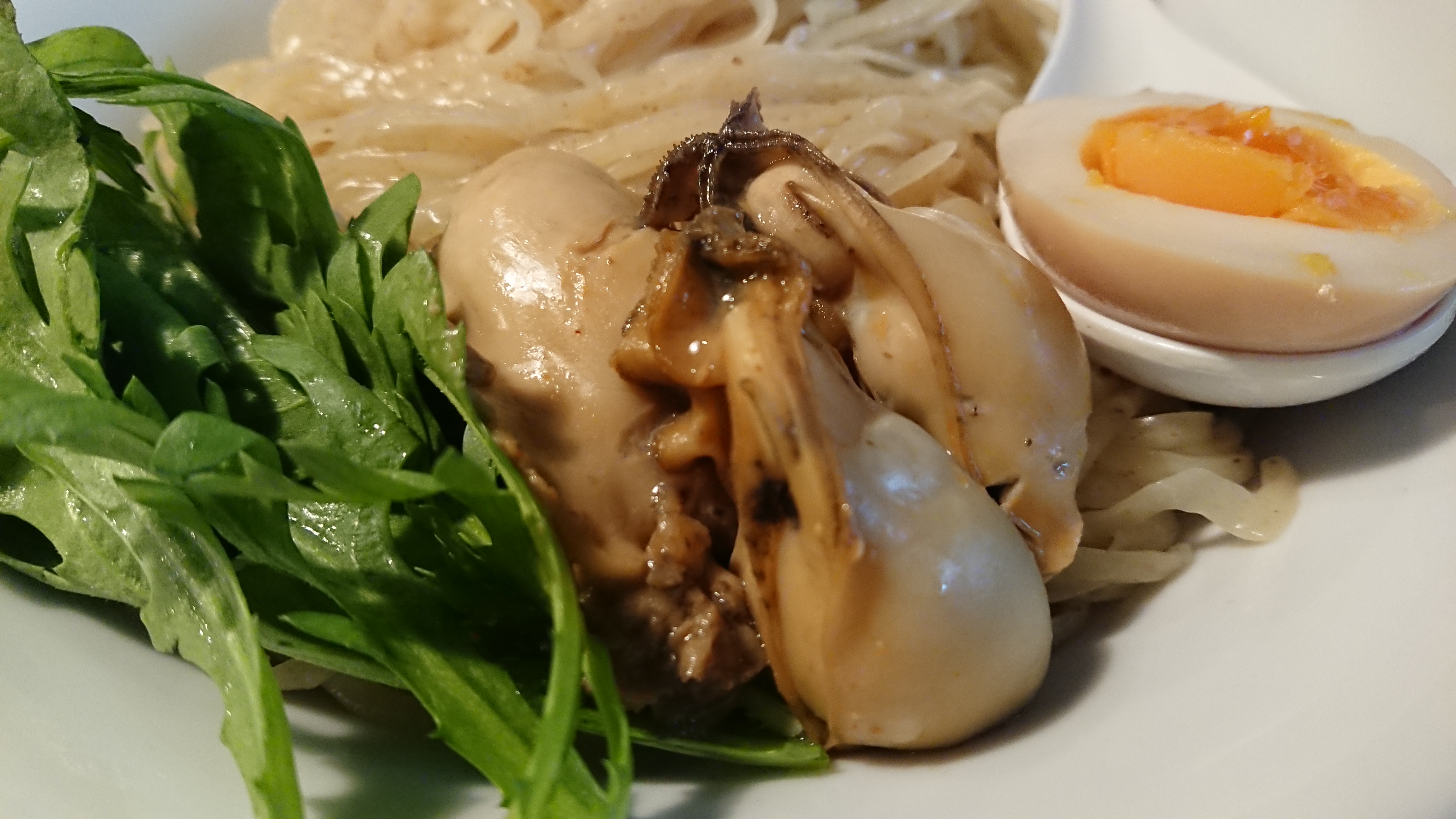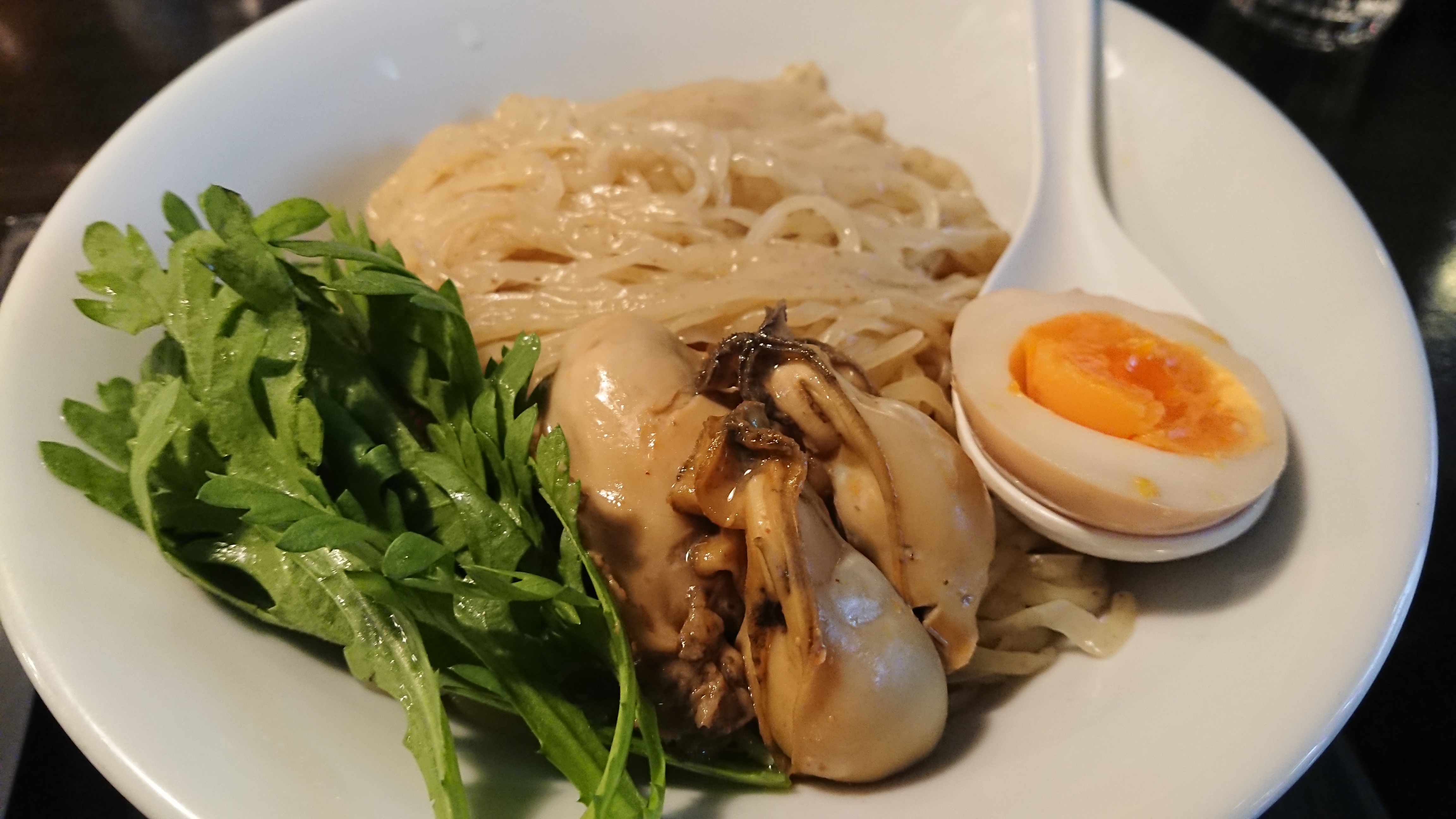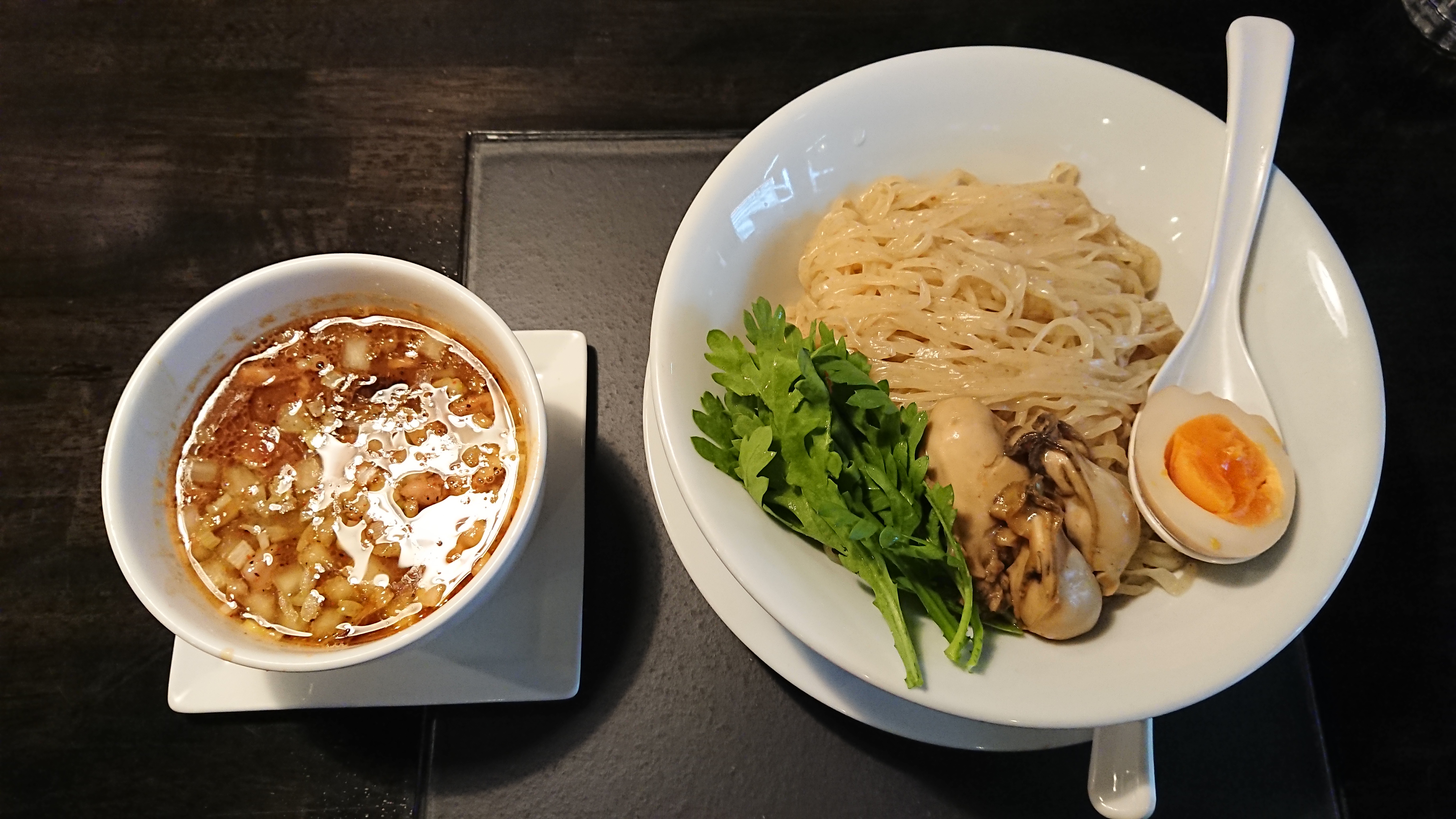 広島県産牡蠣赤味噌つけめん(中太手もみ麺・あつもり・味玉ハーフサービス)1200円