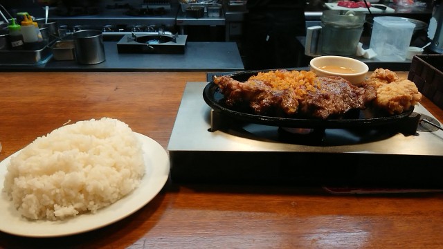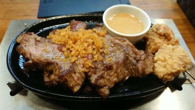 ステーキだけでもかなりのボリュームなのに、唐揚げまでトッピングされてくる。