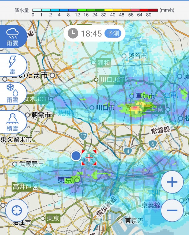 カネキッチンへの外出前の雨雲レーダー
