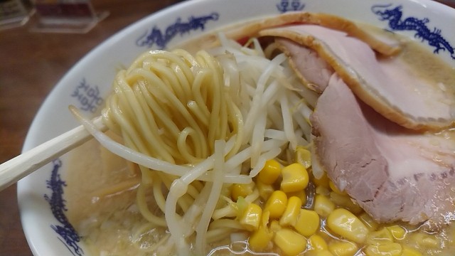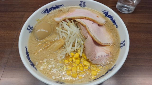 コーンがトッピングされ、チャーシュー増量、煮玉子が入っている。