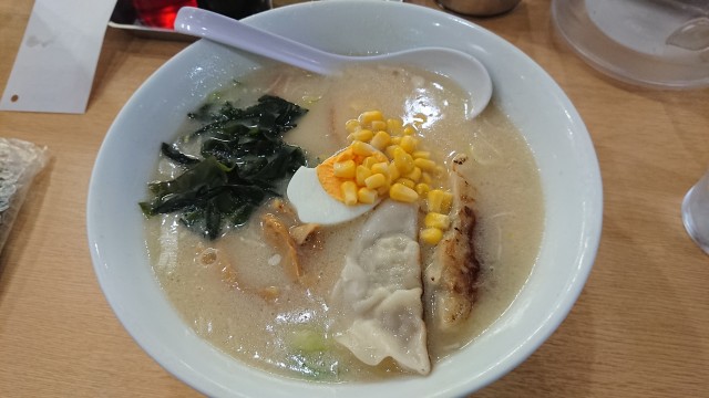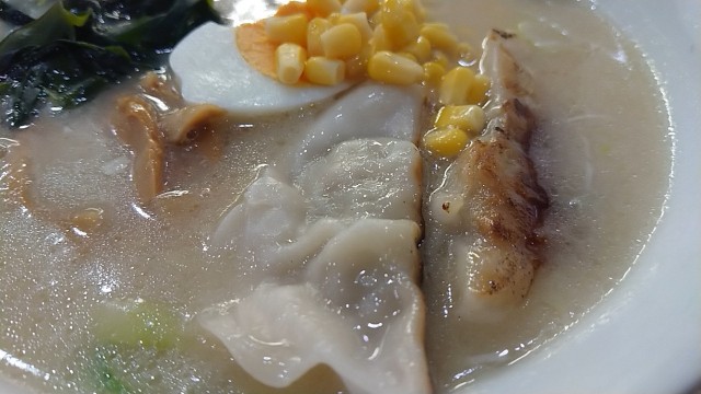 餃子2枚とコーンがトッピングされている。