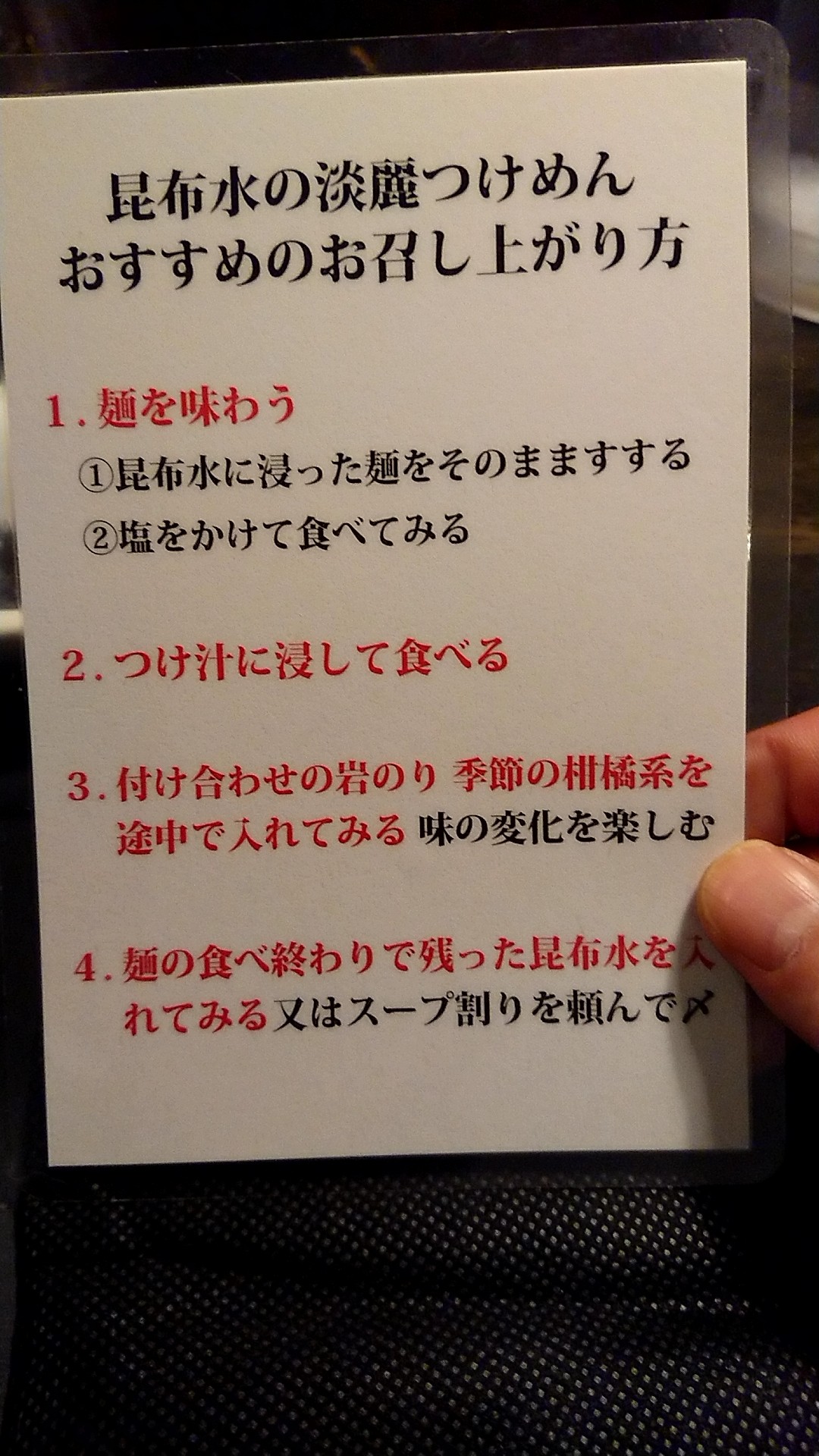 ⑥麺を浸した昆布水をつけ汁に入れる(スープ割は頼まない)