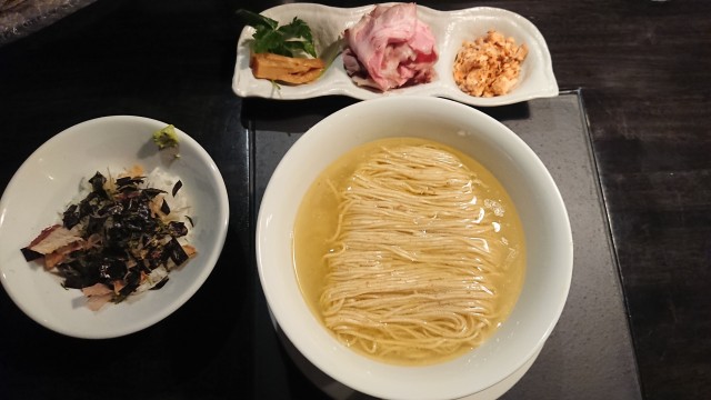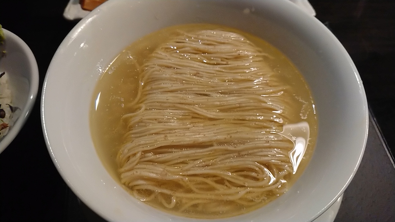そんな作り手の意思を受け止めて、最初は具材をのせないで、鮭と昆布水と、コクのある高価な本枯節(鰹節削り節の原料)で仕上がった塩スープを堪能した。