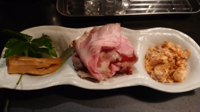 右から鮭、チャーシュー(豚肩ロース3枚と鶏胸肉)、メンマ