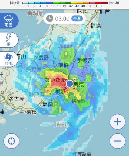 16:00発表の台風15号による東京の降水量(18:00発表も同数値)