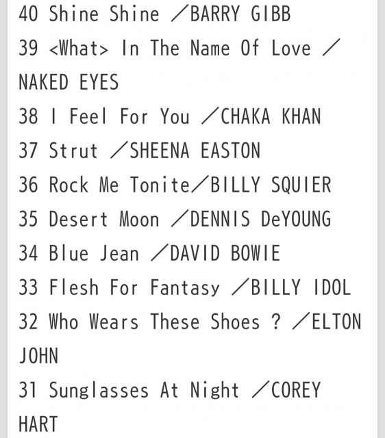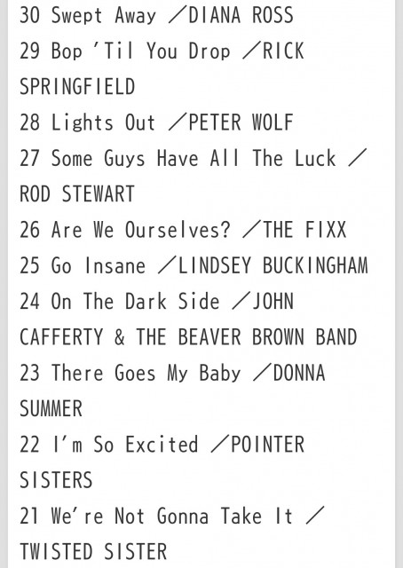 番組構成上、ほぼ毎週欠かさず放送されている40位の曲は別として、今週はよりにもよって「これだけは別に聴きたくもない」と思っていた唯一の曲が放送されてガッカリ(ナイトレンジャー)。