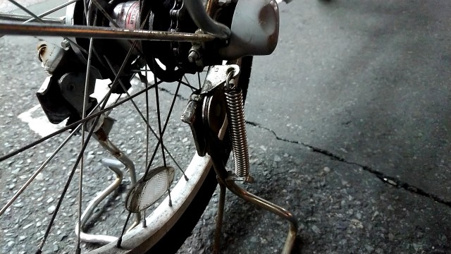 更に、スタンドのスプリング(右)が金属劣化し、自宅駐輪場に落下している始末。