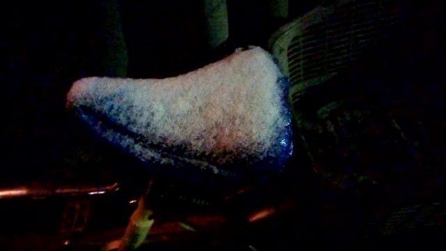 自宅を出ると、自転車のサドルにはうっすらと雪が積もっている。