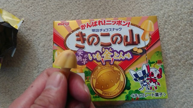帰りに、コンビニで、きのこの山”いも金とん味”を試し買い。