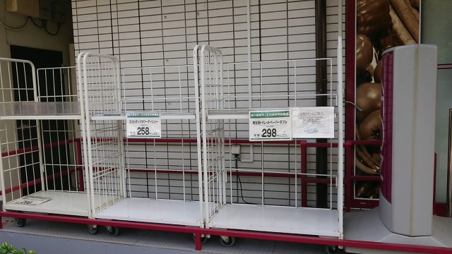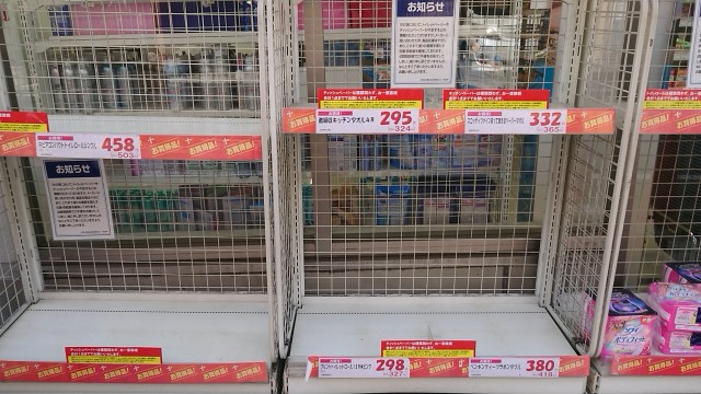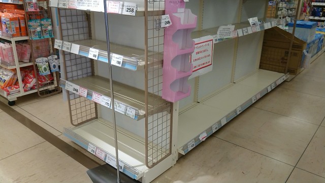 地元近隣のスーパーでは、トイレットペーパー(お店によってはキッチンペーパーやティッシュペーパー)の品薄が続いている。