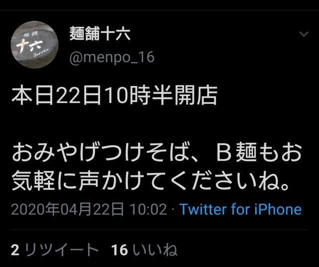 【麺舗十六】第111回 まさか…12:45 本日のラスト客に(コロナ時短営業) 2020/04/22
