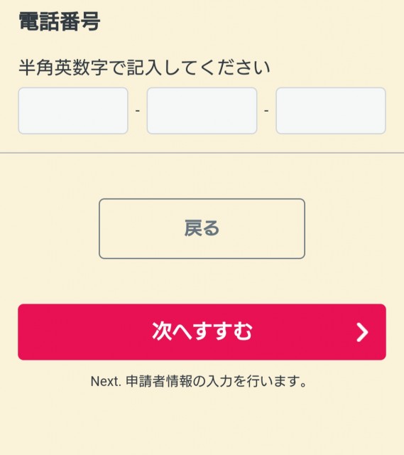 メルアドと電話番号(携帯可)を入力し「次へすすむ」をクリック