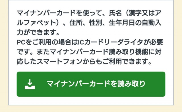 上記入力内容のうち、マイナンバーカードを読み取ることで、カタカナ氏名、郵便番号、電話番号、FAX番号(任意)以外の情報が自動入力される。