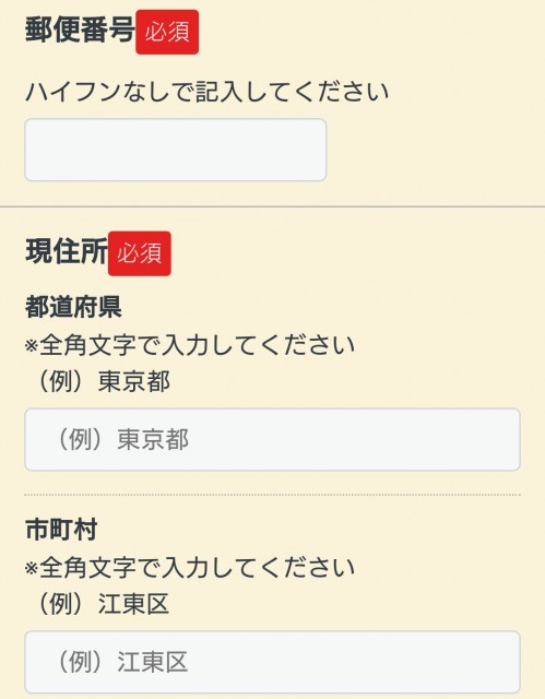住民票を登録した在住地の郵便番号を入力し「地域を検索」をクリックすると、自動で都道府県と市区町村が表示される。