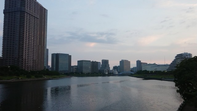 左は大川端リバーシティ、正面右寄りには永代橋。